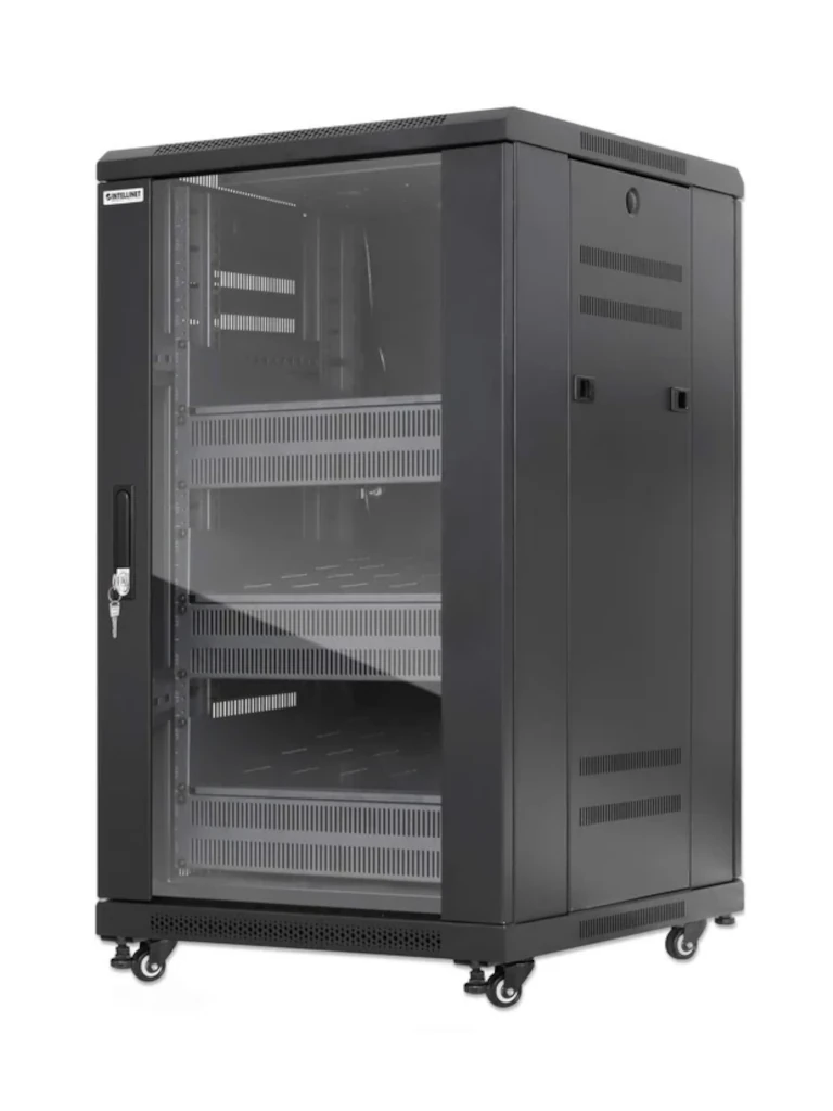 INTELLINET - 716222 - Gabinete 19" Pro Line con extractores de aire, 18U / Frente de 600 mm, unidad de ventilación con dos extractores de aire instalados en el techo, profundidad de 600 mm, Ensamblado, negro RAL 9004