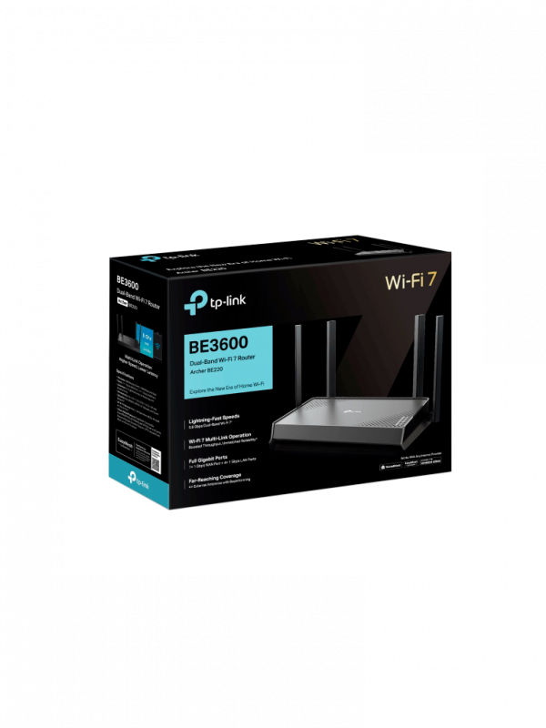 Archer BE220 BE3600 Dual-Band Router WiFi 7 de Doble Banda a 3.6 Gbps, Puertos 1× puerto WAN de 1 Gbps + 4× puertos LAN de 1 Gbps, 4× antenas externas junto con Beamforming, Compatible con EasyMesh