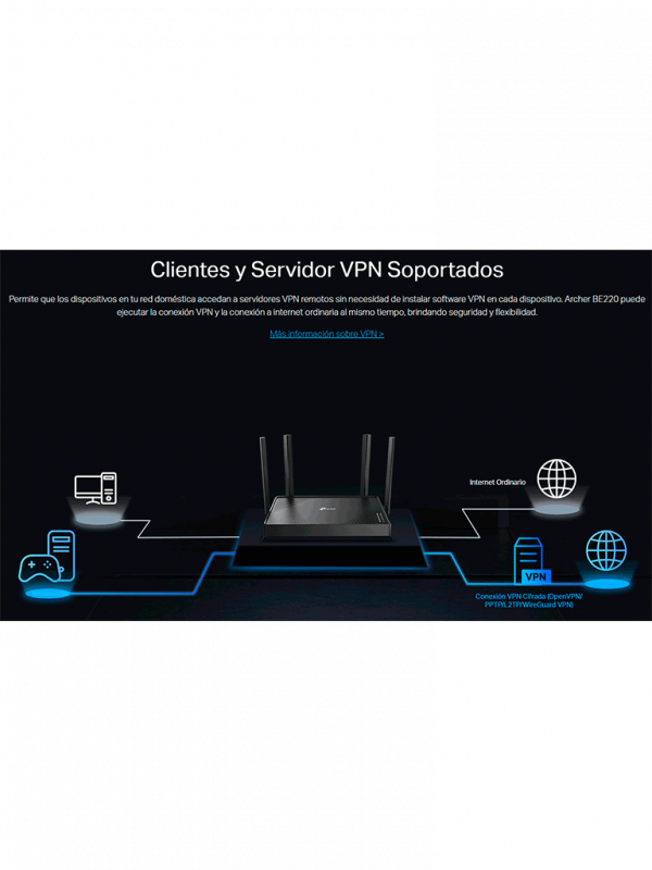 El TP-Link Archer BE220 introduce a los usuarios al siguiente nivel de conectividad con la tecnología Wi-Fi 7 (802.11be). Diseñado como una solución de red de triple banda, este router opera simultáneamente en los espectros de 2.4 GHz, 5 GHz y la banda de 6 GHz para una velocidad agregada de 2.2 Gbps. Su arquitectura aprovecha la tecnología MLO (Multi-Link Operation), permitiendo a los dispositivos utilizar múltiples bandas de manera concurrente. Esta optimización reduce la latencia y mejora el rendimiento, posicionando al BE220 como una opción robusta para los entornos de red que demandan una mayor capacidad y una respuesta más rápida.