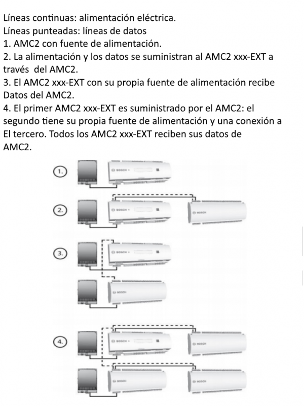 Para una configuración del sistema, el AMC2 16I-16O-EXT, AMC2 16I-EXT, y AMC2 8I-8O-EXT también se pueden usar en combinación, por ejemplo dos AMC2 16I-16O-EXT y un AMC2 8I-8O-EXT – pero el número máximo de módulos que pueden estar conectado también está restringido a tres por AMC2 controlador.