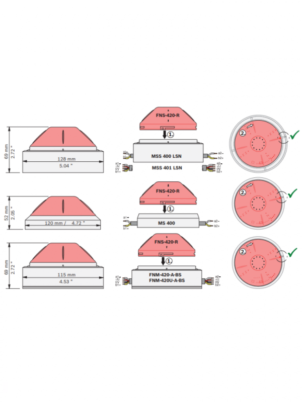 La luz estroboscópica LSN se puede utilizar con las sirenas de base FNM-420-A-BS / FNM-420U-A-BS o las bases de detector con sirena LSN MSS 400 / MSS 401, lo que proporciona una señalización visual y acústica combinada. Montada en la base de detector MS 400, el FNS-420-R puede usarse como luz estroboscópica sin señalización acústica. Ambas aplicaciones se integran fácilmente en una red de seguridad local (LSN) existente.