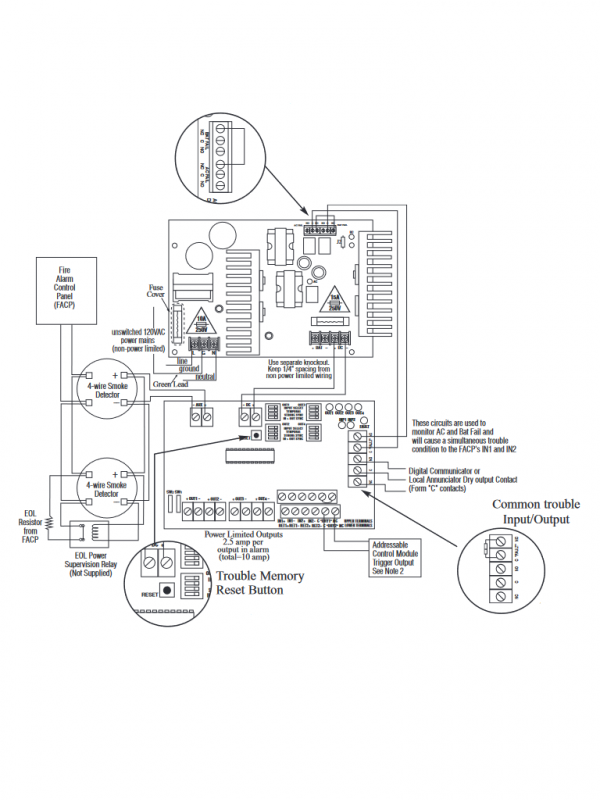 En condiciones sin alarma, la supervisión de bucle independiente para los NAC de FACP Clase A y/o Clase B es provista. En caso de un problema de bucle, el FACP es notificado por la entrada dirigida (entrada 1 o entrada 2). Además, hay terminales de salida de problemas comunes (NC, C, NO) que se utilizan para indicar problemas generales en el circuito o en el sistema. A la entrada de problema común se proporciona para dispositivos opcionales normalmente cerrados (NC) para informar problemas al FACP. Se pueden emplear dos salidas de señalización FACP y dirigido a controlar la supervisión y la entrega de energía a cualquier combinación de las cuatro salidas.