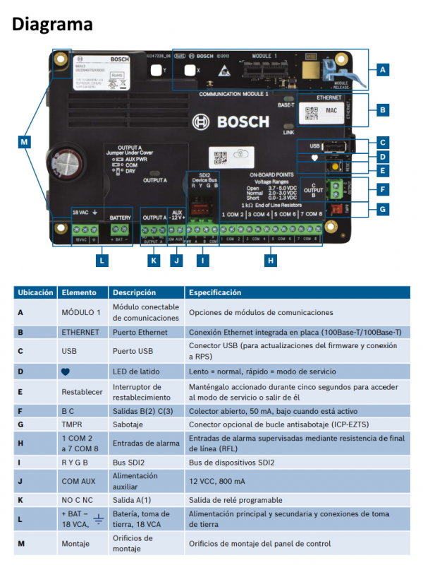 - Salida (alimentación auxiliar, continua y auxiliar conmutada combinadas): 800 mA a 12 VCC nominales.