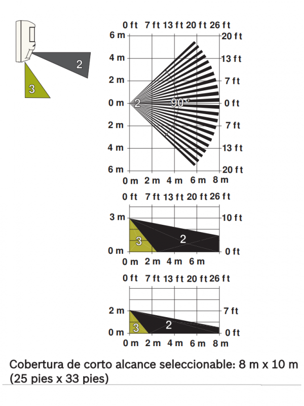 La tecnología de óptica trifocal utiliza una óptica con tres longitudes focales específicas: cobertura de largo alcance, cobertura de alcance medio y cobertura de corto alcance. El detector aplica estas tres longitudes focales a 86 zonas de detección, que se combinan para crear 11 sólidas cortinas de detección. La tecnología de óptica trifocal también incluye dos sensores piroeléctricos, que proporcionan el doble de la ganancia óptica estándar. Los sensores procesan múltiples señales para proporcionar un rendimiento preciso, prácticamente libre de falsas alarmas.