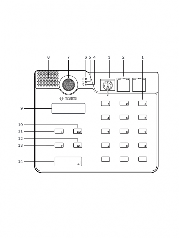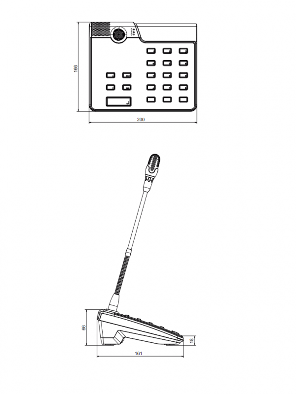 Esta estación de llamada incorpora de serie un micrófono de cuello flexible con protección antirruido y supervisión permanente, un total de 20 botones, una pantalla LC iluminada y un altavoz integrado.