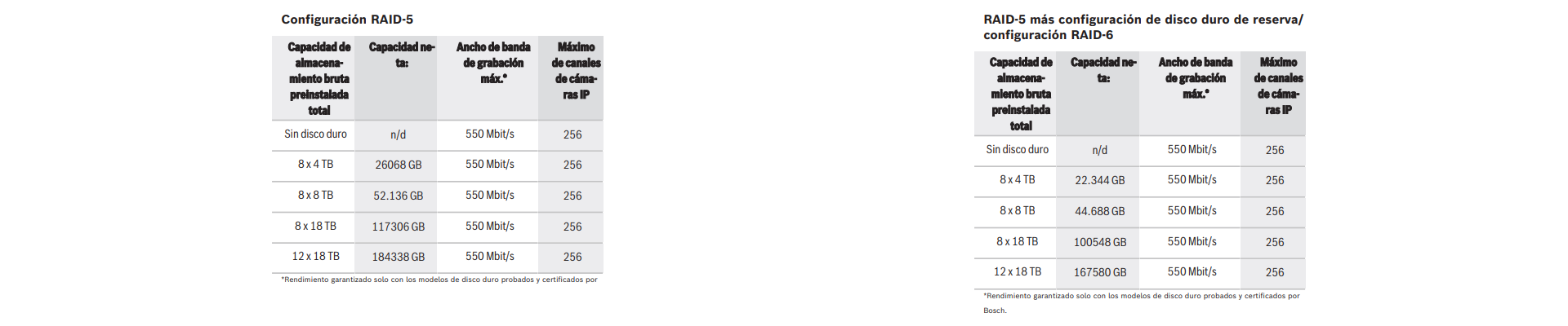 Estos valores hacen referencia al motor de grabación BVMS / VRM, capacidad neta para una configuración RAID-5 sin disco duro de reserva, 256 canales de cámara IP con licencia que ofrecen hasta 256 sesiones de grabación iSCSI y 4 clientes de reproducción con un ancho de banda de reproducción combinado de 150 Mbps. Estas especificaciones hacen referencia a cualquiera de los tres modos de funcionamiento.