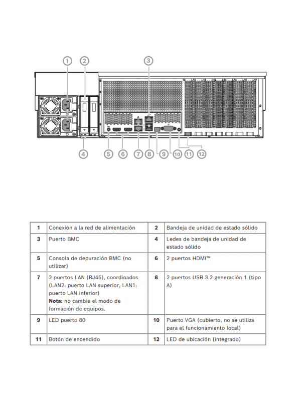 Estos valores hacen referencia al motor de grabación BVMS / VRM, capacidad neta para una configuración RAID-5 sin disco duro de reserva, 256 canales de cámara IP con licencia que ofrecen hasta 256 sesiones de grabación iSCSI y 4 clientes de reproducción con un ancho de banda de reproducción combinado de 150 Mbps. Estas especificaciones hacen referencia a cualquiera de los tres modos de funcionamiento.