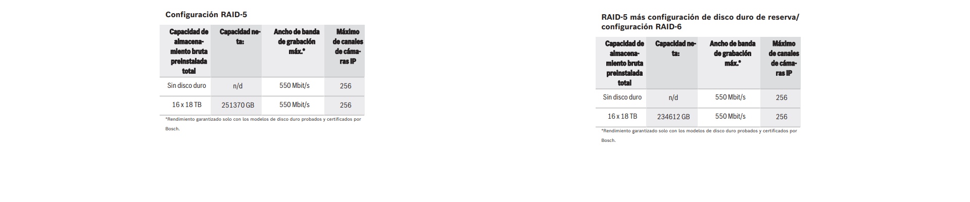 Estos valores hacen referencia al motor de grabación BVMS / VRM, capacidad neta para una configuración RAID-5 sin disco duro de reserva, 256 canales de cámara IP con licencia que ofrecen hasta 256 sesiones de grabación iSCSI y 4 clientes de reproducción con un ancho de banda de reproducción combinado de 150 Mbps. Estas especificaciones hacen referencia a cualquiera de los tres modos de funcionamiento.