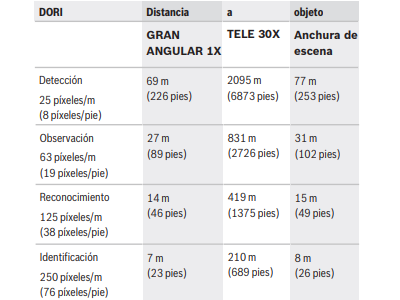 DORI (Detectar, Observar, Reconocer, Identificar) es un sistema estándar (EN-62676-4) para definir la capacidad que tiene una persona al mirar el vídeo para distinguir personas u objetos dentro de un área de cobertura. A continuación se muestra la distancia máxima a la que una combinación de cámara/lente puede cumplir estos criterios: