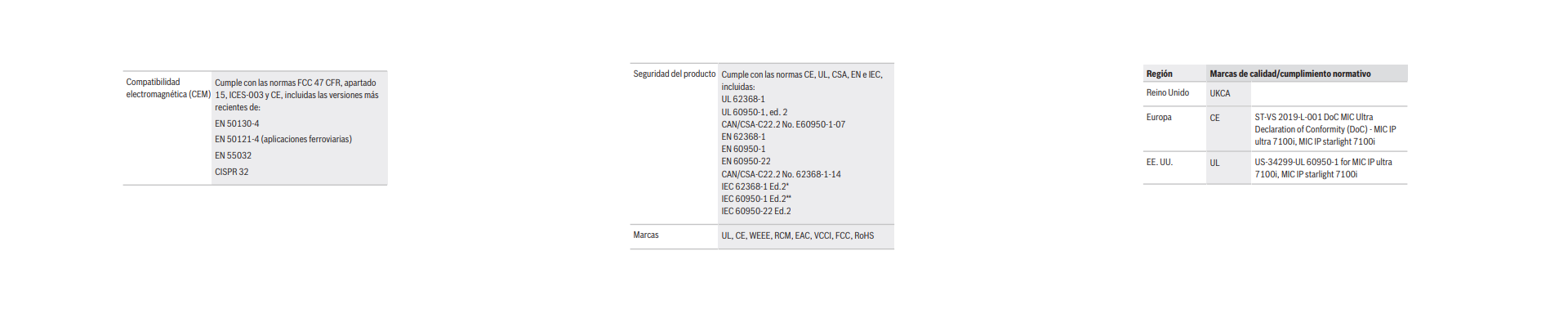 Para obtener una lista completa de todas las certificaciones y los estándares relacionados, consulte el informe de pruebas de productos disponible en el catálogo en línea, en la pestaña Documentos de la página de producto del dispositivo. Si el documento no está disponible en la página del producto, póngase en contacto con su representante de ventas.