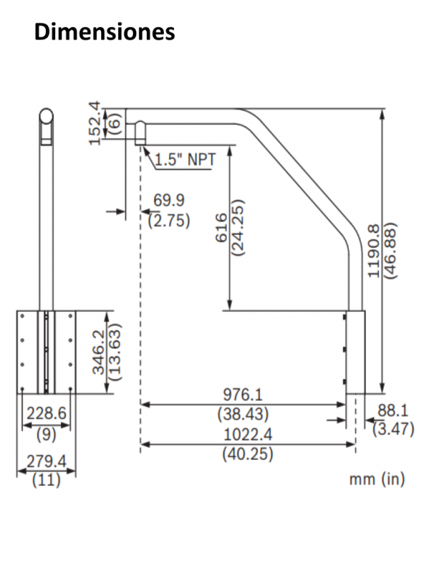- Dimensiones de la placa de montaje 279 x 346 mm (11 x 13,6 pulg.).