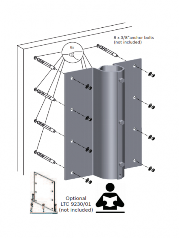 El soporte de montaje en azotea se puede utilizar para instalar las cámaras en azoteas, bordes de balcones o laterales de puentes. Estos soportes de montaje se ajustan al interior o el exterior de una pared adecuada y se pueden girar para facilitar la colocación y el mantenimiento de las cámaras. Existe un adaptador de montaje opcional para tejado plano (LTC9230/01) para el montaje sobre una superficie plana. El soporte de azotea puede girar para conseguir flexibilidad para una instalación segura y sencilla de la cámara en un techo.