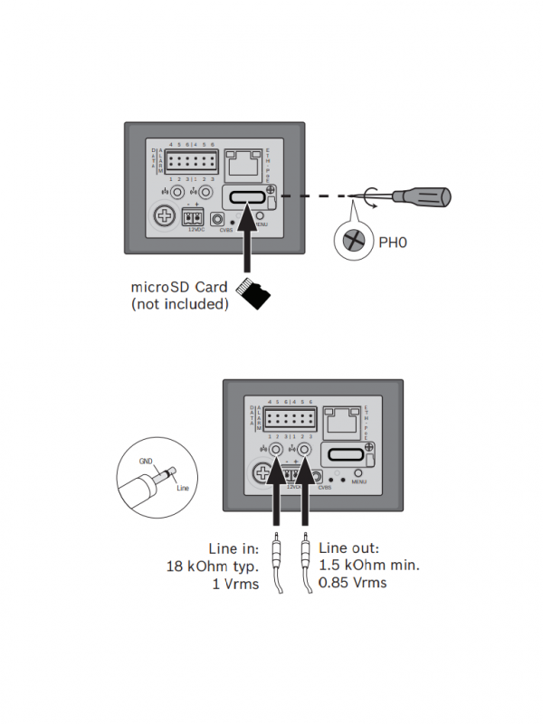 Inserte una tarjeta de memoria en la ranura para tarjeta para almacenar una grabación con alarma local de hasta 2 TB. La grabación previa a la alarma en la RAM reduce el ancho de banda de grabación en la red y amplía la vida efectiva de la tarjeta de red.