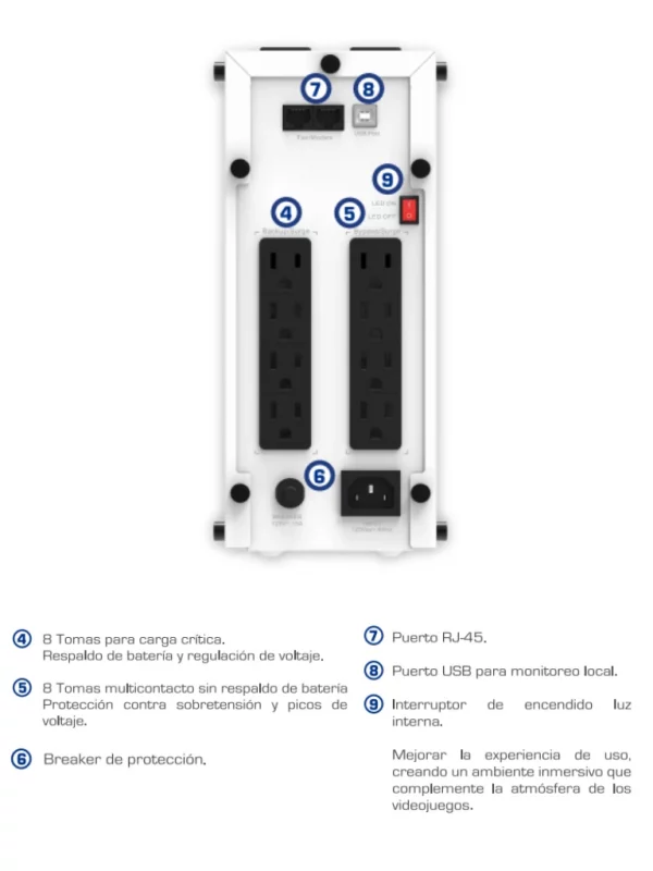 - Salidas de respaldo: 8 tomas NEMA con respaldo/AVR/supresión de picos