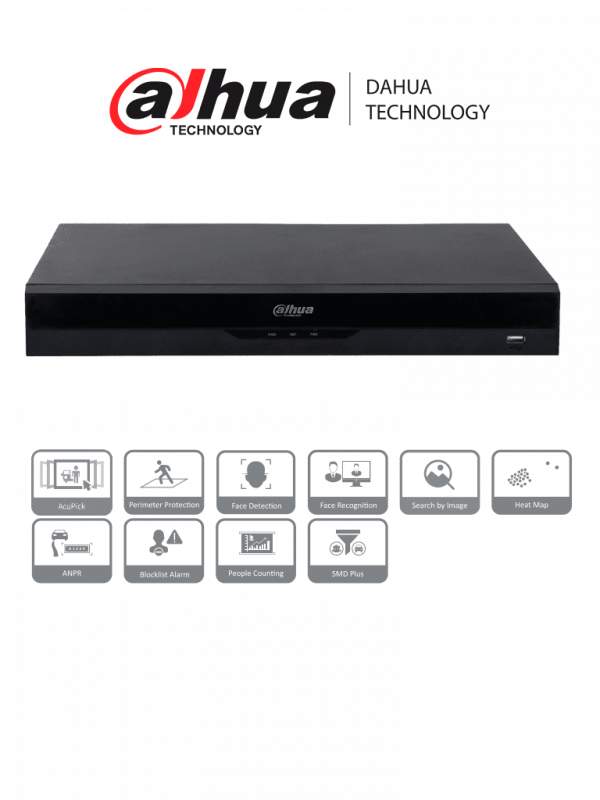 DAHUA NVR5216-16P-EI NVR IP WizSense de 16 canales 1U/ 16PoE/ 2HDD/ H.265+/H.265/ 384 Mbps/ AcuPick / N+M cluster/ IA por grabador: FD y FR /Protección perimetral/ SMD Plus