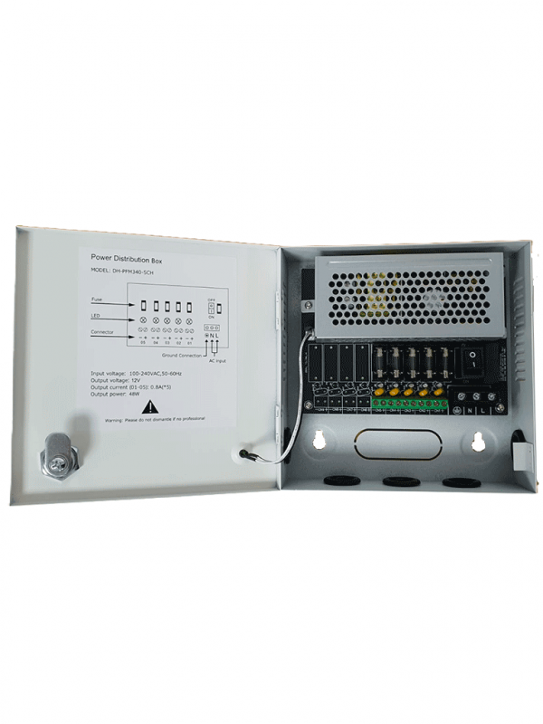 La fuente de poder DAHUA PFM340-5CH está diseñada para alimentar hasta 5 cámaras de seguridad al mismo tiempo, proporcionando una salida estable de 12 VCD y 4 amperes.