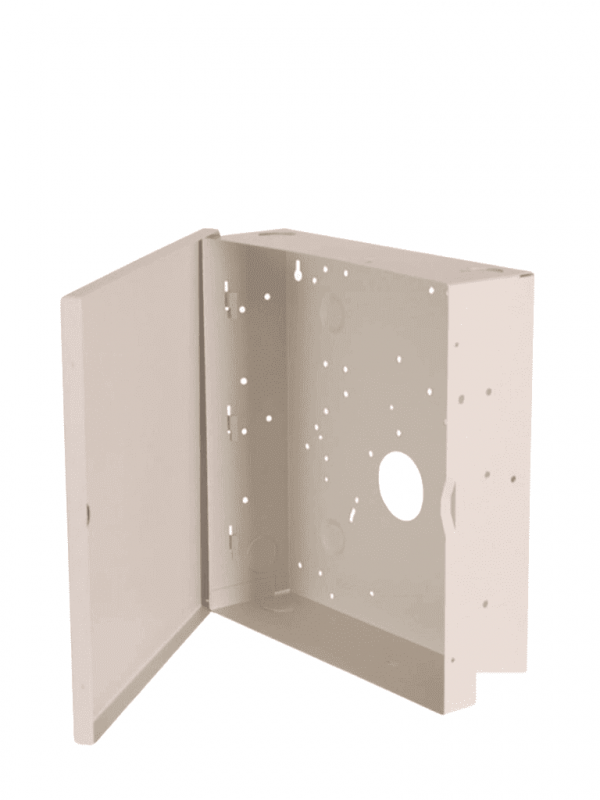 Gabinete grande con perforaciones para instalar en superficie, ideal para los paneles de alarma de la serie Power y Neo, capacidad para alojar panel y hasta tres módulos más.
