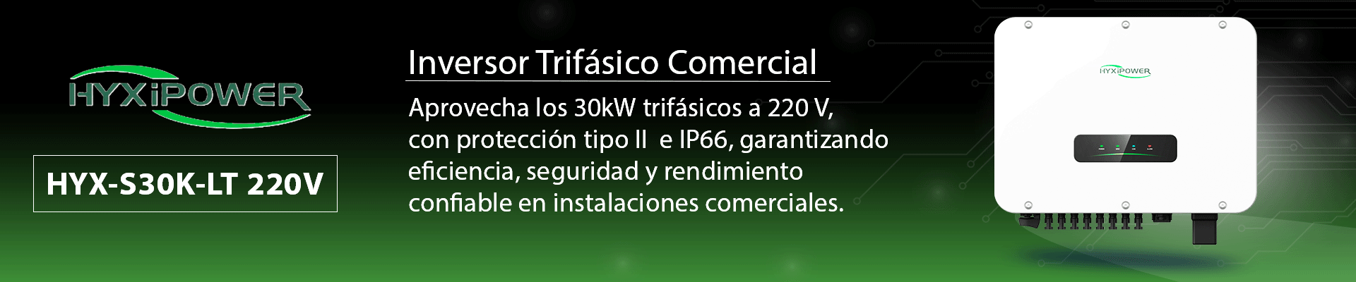 HYXIPOWER HYX-S30K-LT 220V – Inversor de cadena trifásico comercial, Potencia de Salida 30,000 W, Protección contra sobretensión tipo II, Indice de Protección IP66, Administración remota