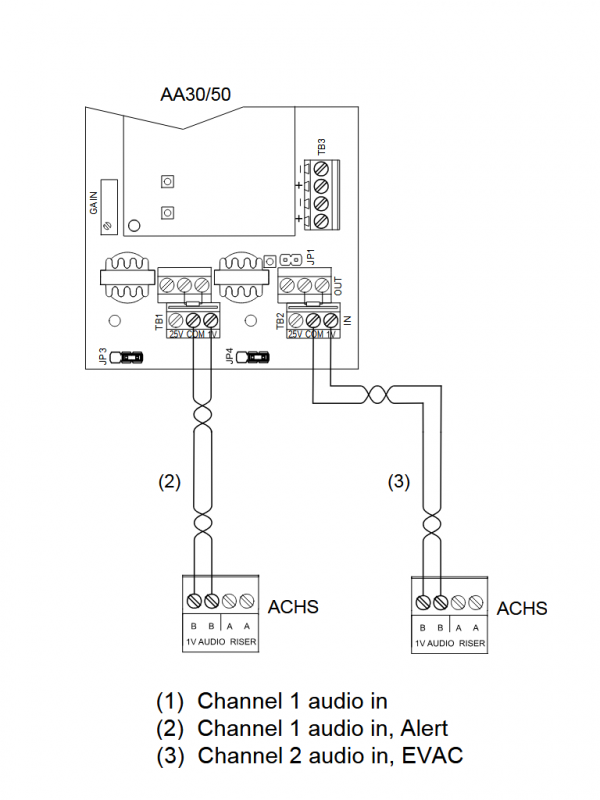 El panel de control admite hasta tres tarjetas selectoras de canal de audio ACHS que convierten el audio digital de una tarjeta EAEC en una señal de preamplificador analógico. La tarjeta de audio vertical consta de un par (Clase B) o dos pares (Clase A o Clase X) de cables que conectan todos los amplificadores SIGA-AA30/50 alojados en un gabinete independiente. Dado que las señales digitales se multiplexan, cualquier fuente de audio independiente puede dirigirse a cualquier amplificador conectado a la red. Todas las señales de comando y control del sistema de audio se distribuyen a través de la tarjeta de datos de la red.