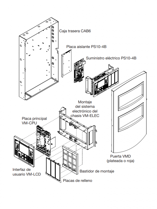 VM-1R (inglés) Sistema completo FACP con interfaz de usuario, CPU, un bucle direccionable, cuatro NAC de Clase B, fuente de alimentación universal de 110/220 v de 10 A, puerta roja. Solicite VM-SLC para un segundo bucle.