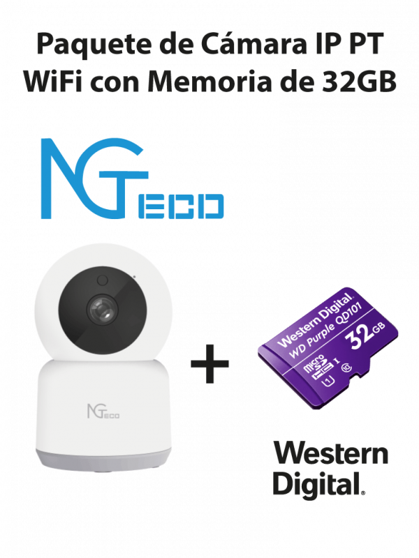 NGTECO NGC2401PAK – Paquete de Cámara NGC2401 IP PT WiFi 1080P con Memoria de 32GB Micro SDHC/ Linea Purple/ Clase 10 U1