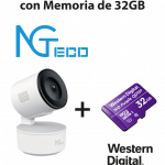 NGTECO NGC4200 – Cámara PT WiFi de 3MP con lente de 3.6mm, altavoz y micrófono integrados. Ofrece audio bidireccional y alcance IR de 20m. Utiliza compresión de vídeo H.265. Compatible con almacenamiento local y en la nube. Funciona con Alexa