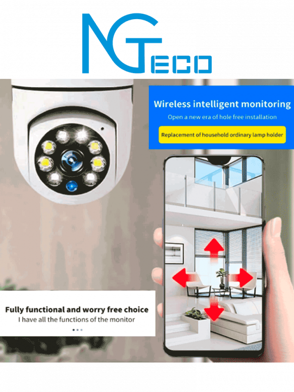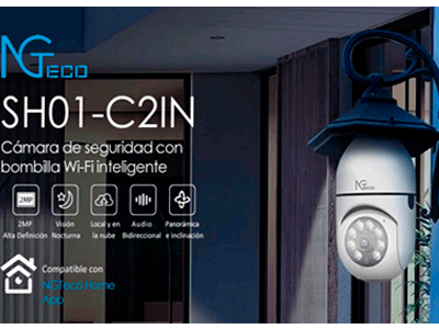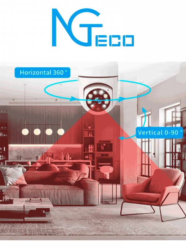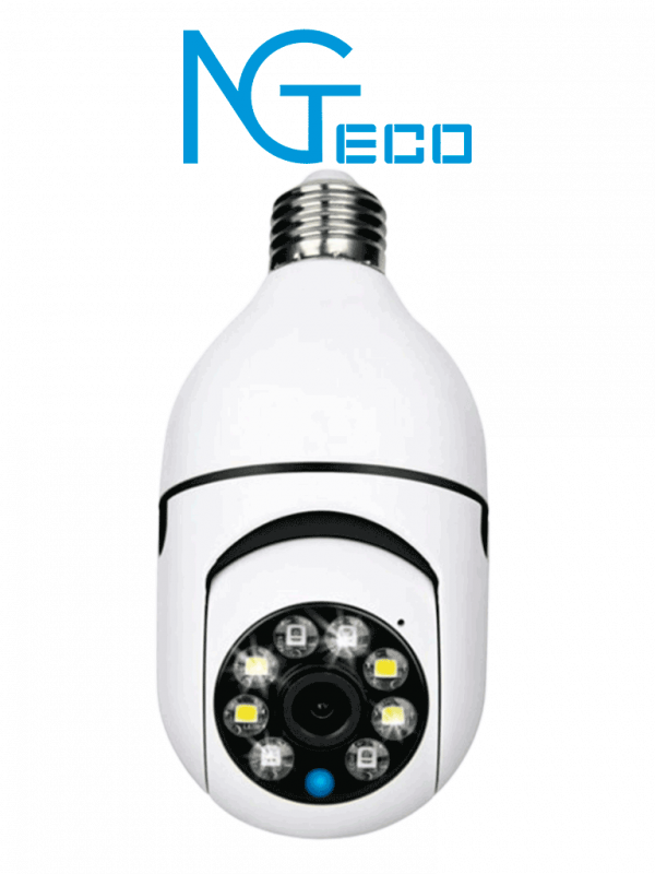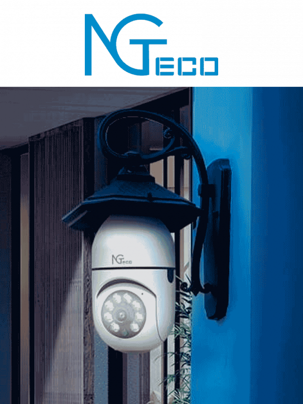 NGTECO NGSH01C2IN – Foco con Cámara Inteligente WiFi / 2MP / Visión PTZ 355° / Lente HD 4mm / Visión Nocturna IR + Luz Blanca / Audio 2 Vias / Almacenamiento Local y en la Nube / Onvif / Compatible con Alexa y Asistente de Google