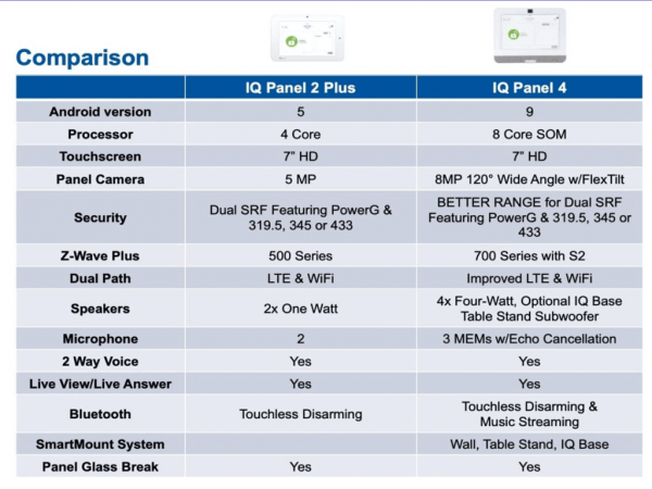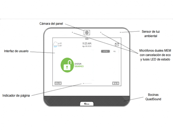 El IQ Panel 4 incluye un comunicador AT&t LTE y una tarjeta WIFI de doble banda. Por seguridad, se admiten los sensores PowerG de 915 MHz y 345 Mhz de Honeywell. Tiene una elegante pantalla táctil HD All-In-One de vidrio capacitivo de 7″ y admite 128 zonas y 242 usuarios.