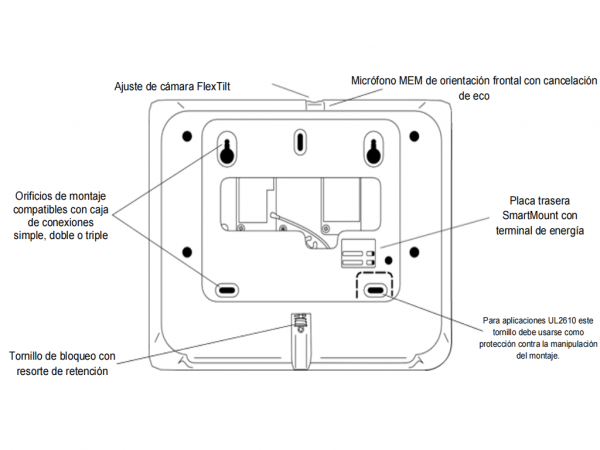 Tiene una cámara de 8 megapíxeles mejorada con Flex-Tilt para ajustar el ángulo de visión, toma fotos al desarmar y videos de emergencia. El sistema de instalación SmartMount brinda opciones fáciles de montaje en la pared o en un soporte de mesa. Dual SRF con PowerG proporciona conexión inalámbrica cifrada segura de largo alcance con compatibilidad con la tecnología inalámbrica de seguridad heredada ya instalada en el hogar o el edificio.