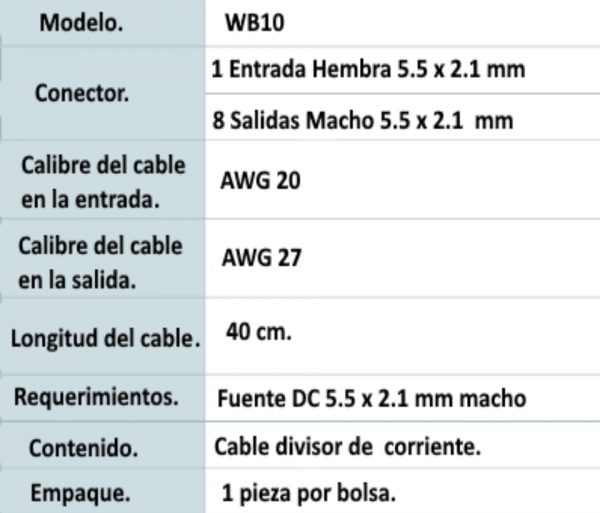 Cable tipo pulpo para suministro y distribución de corriente eléctrica para 8 camaras de CCTV , desde una sola fuente de energía. Tiene 8 conectores machos de 2.1mm para las camaras y un conector hembra para la fuente.