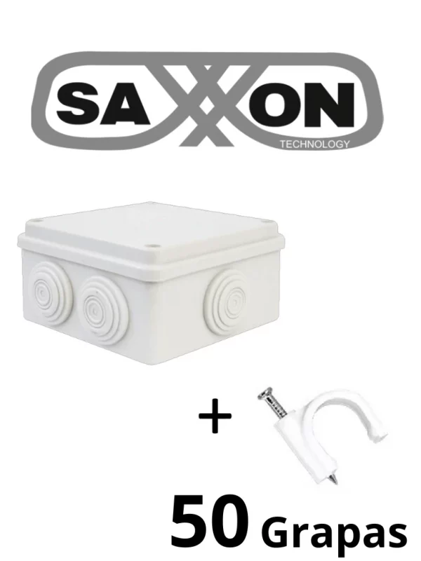 SAXXON SWD015LMGNCC5MMR – Paquete de Caja de Conexiones 8 Entradas 150x150x70mm con Bolsa de Grapas Redondas de Pared de 6mm de alto Color Blanco 50 piezas