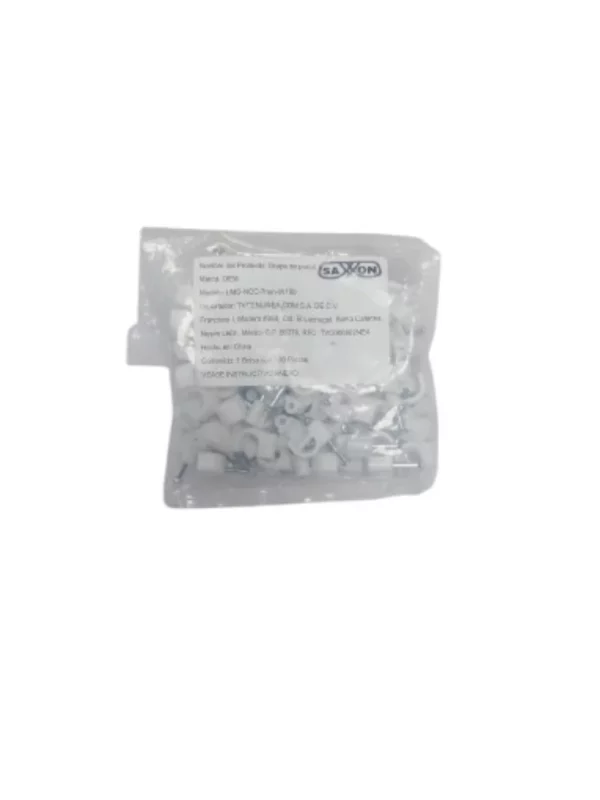 Grapa para cable redondo de 6mm, sujeta los cables en muros y techos de diversas instalaciones de audio o video. Su cuerpo es de plástico blanco resistente y tiene un clavo integrado que es de metal resistente a la corrosión. El empaque contiene 50 piezas y para colocarlos sólo se necesita un martillo para fijar las grapas.