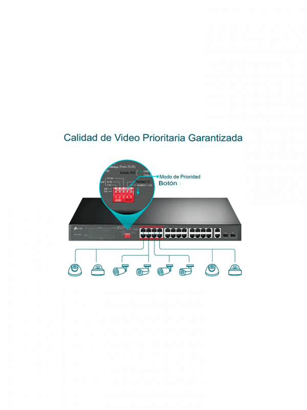 TP-LINK TL-SL1226P – Switch PoE+ no administrable con 26 puertos 10/100 Mbps, 2 puertos 10/100/1000 Mbps y 2 puertos SFP. Incluye 8 puertos extensores PoE (hasta 250 m) con una capacidad de 250W, diseñado específicamente para vigilancia IP.