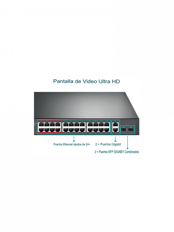 • 24 puertos PoE + 10/100 Mbps RJ45, 2 puertos Gigabit RJ45 y 2 ranuras combo Gigabit SFP
