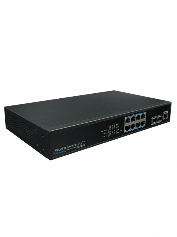 - Puertos: 8 puertos Ethernet Gigabit (10/100/1000 Mbps) compatibles con PoE 802.3af/at y 2 puertos SFP para conectividad de fibra óptica.