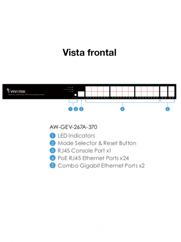 VIVOTEK AW-GEV-267A-370 – VIVOCAM Switch PoE Administrable L2+ con 24 puertos PoE GE RJ45, 2 puertos Combo GE RJ45/SFP, 370W totales (30W por puerto), 52Gbps de velocidad y gestión de vigilancia IP.