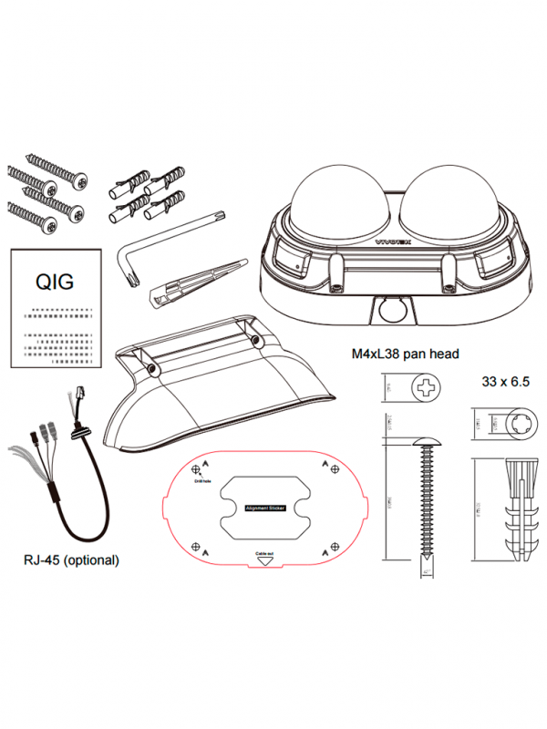 - Conectores: RJ-45, Entrada de línea de audio*, Salida de línea de audio*, entrada digital: 1*, Salida digital: (DO+: 12V, 50mA; DO-: 30V, Drenaje abierto, 1A)*, * Requiere cable AO-015
