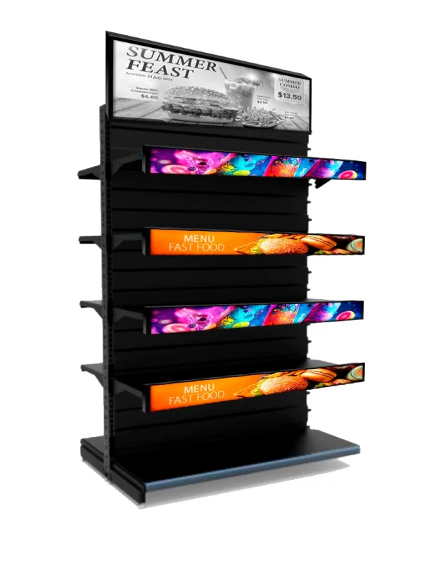 Pantalla LCD profesional de 35 pulgadas con formato ultra panorámico, diseñada para publicidad digital en estanterías de tiendas y supermercados. Su estructura metálica, diseño delgado y sistema Android 8.1 permiten instalarla fácilmente en espacios reducidos y mostrar contenido visual directamente en el punto de venta. Ideal para promociones, precios y campañas visuales que capten la atención del cliente.