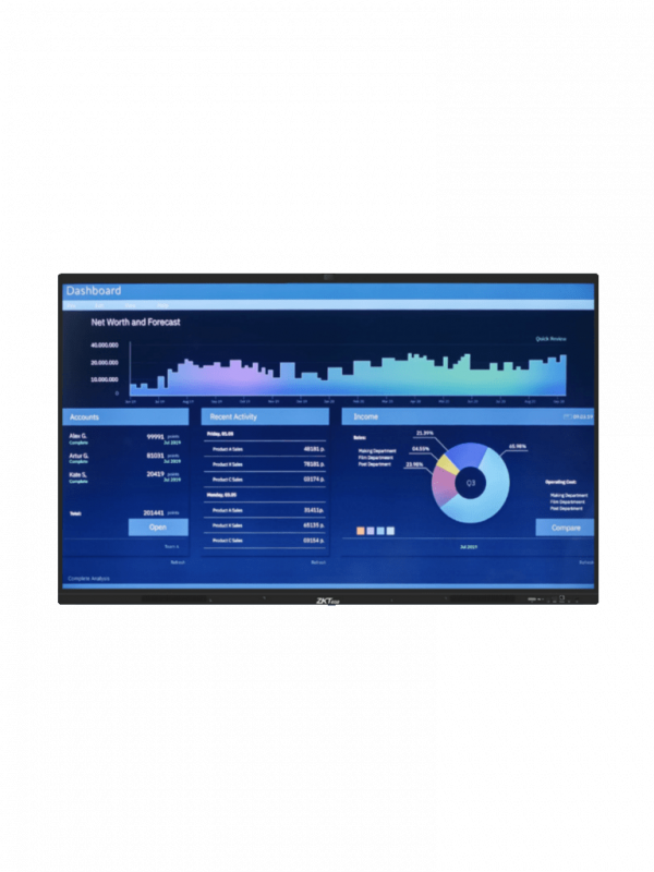 La pantalla digital interactiva ZK – IWB86B nos proporciona una solución para reuniones virtuales y/o presentaciones interactivas, permite el intercambio de contenido y funcion táctil interactiva que lo ayudan a facilitar de un mejor modo las presentaciones, la generación de ideas y la toma decisiones. Integra una cámara de 13 MP y una matriz de 6 micrófonos con una distancia de captura de hasta 8 metros, que nos brinda una excelente experiencia de audio y video, con sus múltiples puntos táctiles nos permite una gran interacción de imágenes y el pizarrón interactivo. Compatible con las aplicaciones de reuniones más usadas (Zoom, Teams, Meet, etc.).